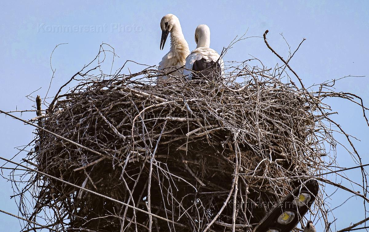 Жанровая фотография. Аисты в гнезде на столбе.