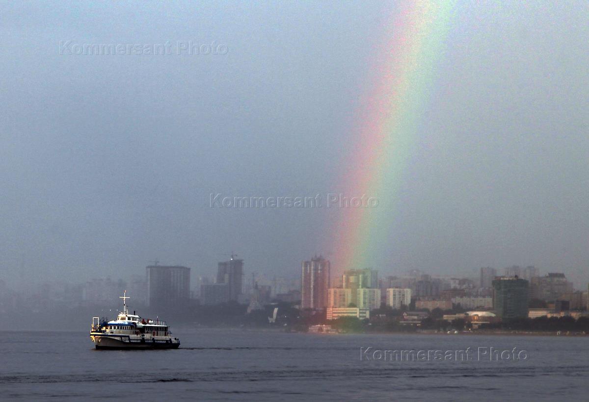 Виды Самары. Жанровая фотография. Теплоход во время речной прогулки и радуга над рекой Волгой.