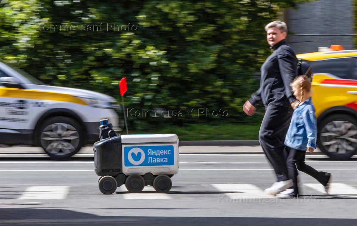 Жанровая фотография. Робот-доставщик от компании "Яндекс" едет по улице города.