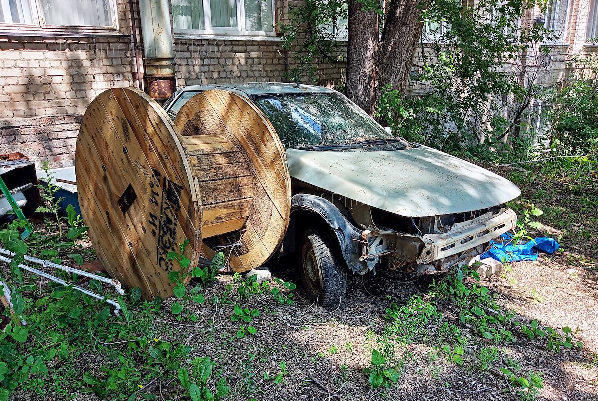 Жанровая фотография. Старый разбитый автомобиль под окнами жилого дома. Пустая деревянная катушка…