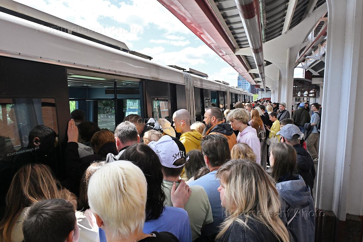 Последний день работы Московского монорельса. Жанровая фотография. Пассажиры на платформе перед…
