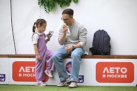 Празднование Дня молодежи на Болотной площади. Жанровая фотография. Молодой папа с дочкой едят…