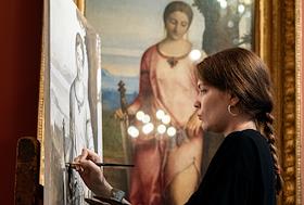 Жанровая фотография. Студентка художественного вуза во время копирования экспонатов в…