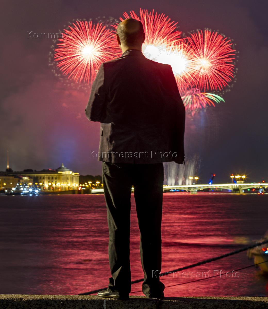Праздник выпускников школ "Алые паруса". Праздничный салют. Мужчина смотрит шоу с набережной Невы.
