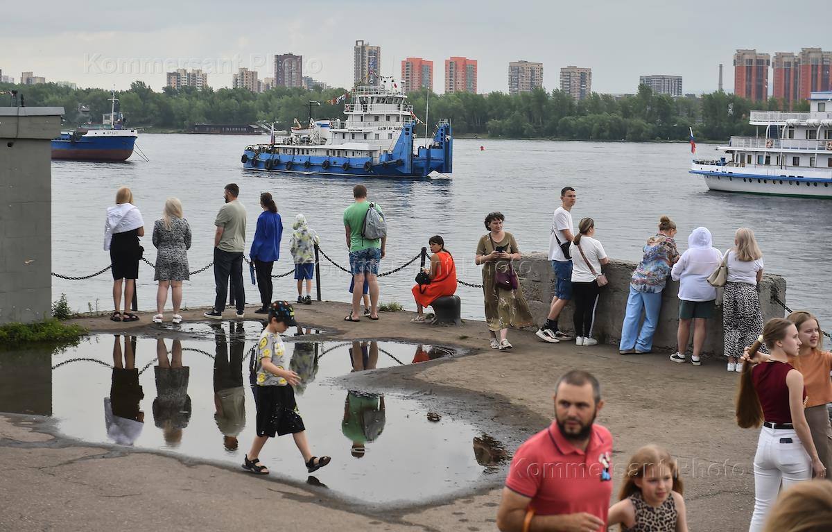 Жанровые фотографии. Праздничный парад судов на реке Енисей в Красноярске в честь Дня работников морского и речного флота.