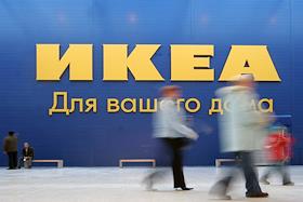 Рабочие везут тележки с пакетами для покупок по торговому центру "ИКЕА".
