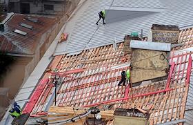 Жанровая фотография. Работники ЖКХ ремонтируют кровлю жилого дома в центре города.
