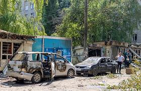 Последствия попадания беспилотного летательного аппарата (БПЛА) на жилой район города. Разбитий…