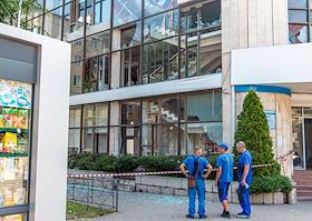 Последствия попадания беспилотного летательного аппарата (БПЛА) на жилой район города. Стекла…