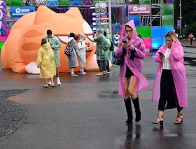 Музыкальный фестиваль "VK Fest 2025" в спортивном комплексе "Лужники". Зрители во время дождя на…