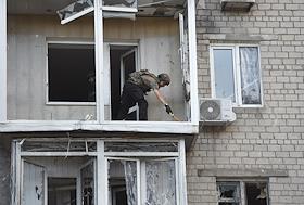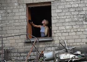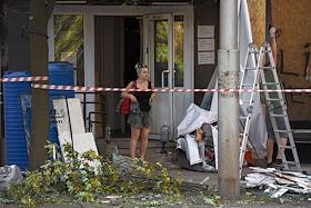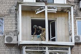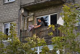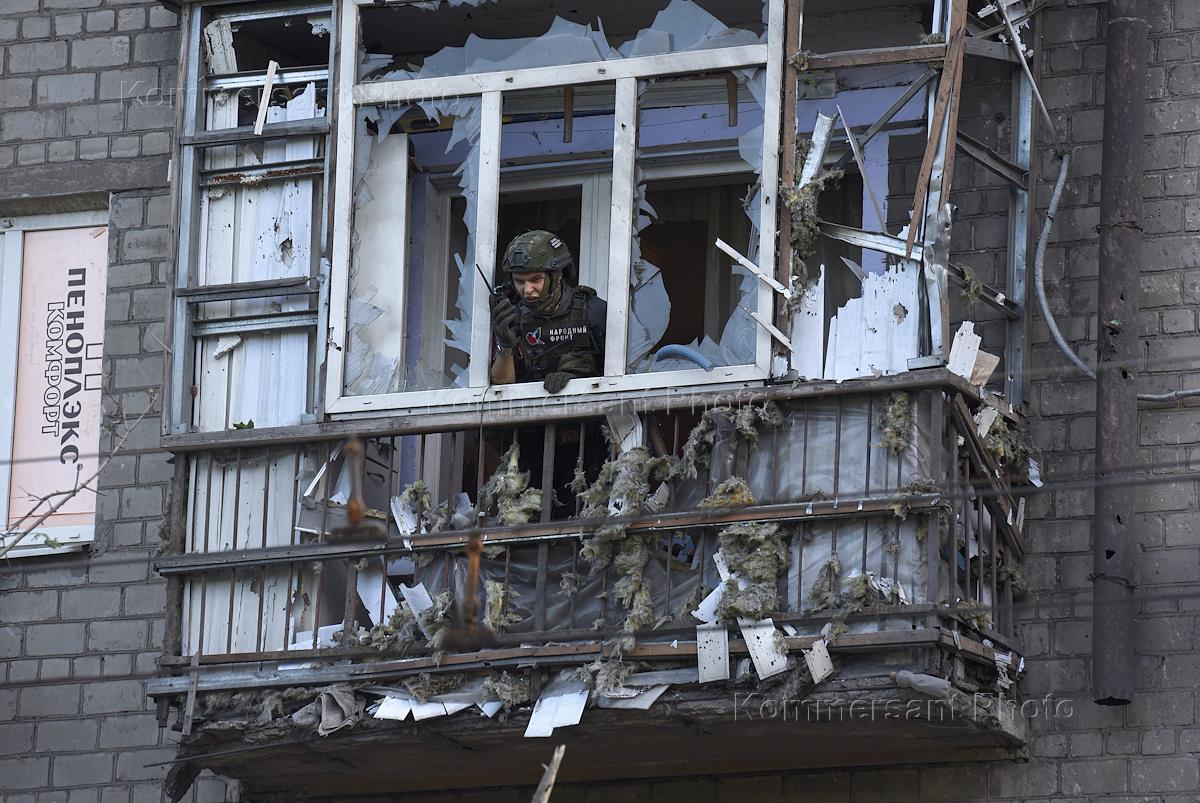 Ситуация в центре Донецка после обстрела. Жительница в проеме окна дома, пострадавшего в результате…