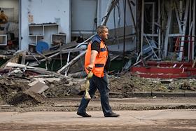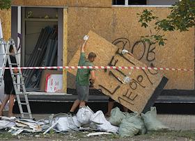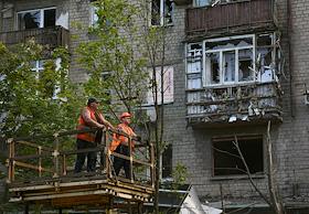 Ситуация в центре Донецка после обстрела. Рабочие ремонтируют фасад дома, пострадавшего в результате…