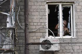 Ситуация в центре Донецка после обстрела. Мужчина в окне жилого дома, пострадавшего после обстрела.