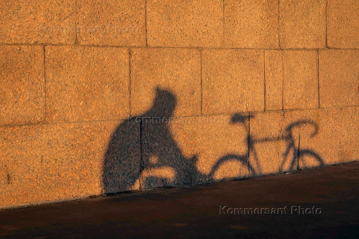 Жанровая фотография. Тень мужчины с велосипедом на стене набережной реки.