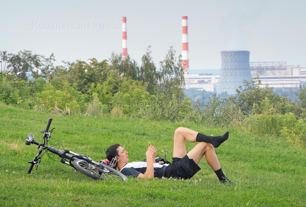 Виды Владимира. Жанровая фотография. Велосипедист отдыхает лежа на траве.