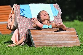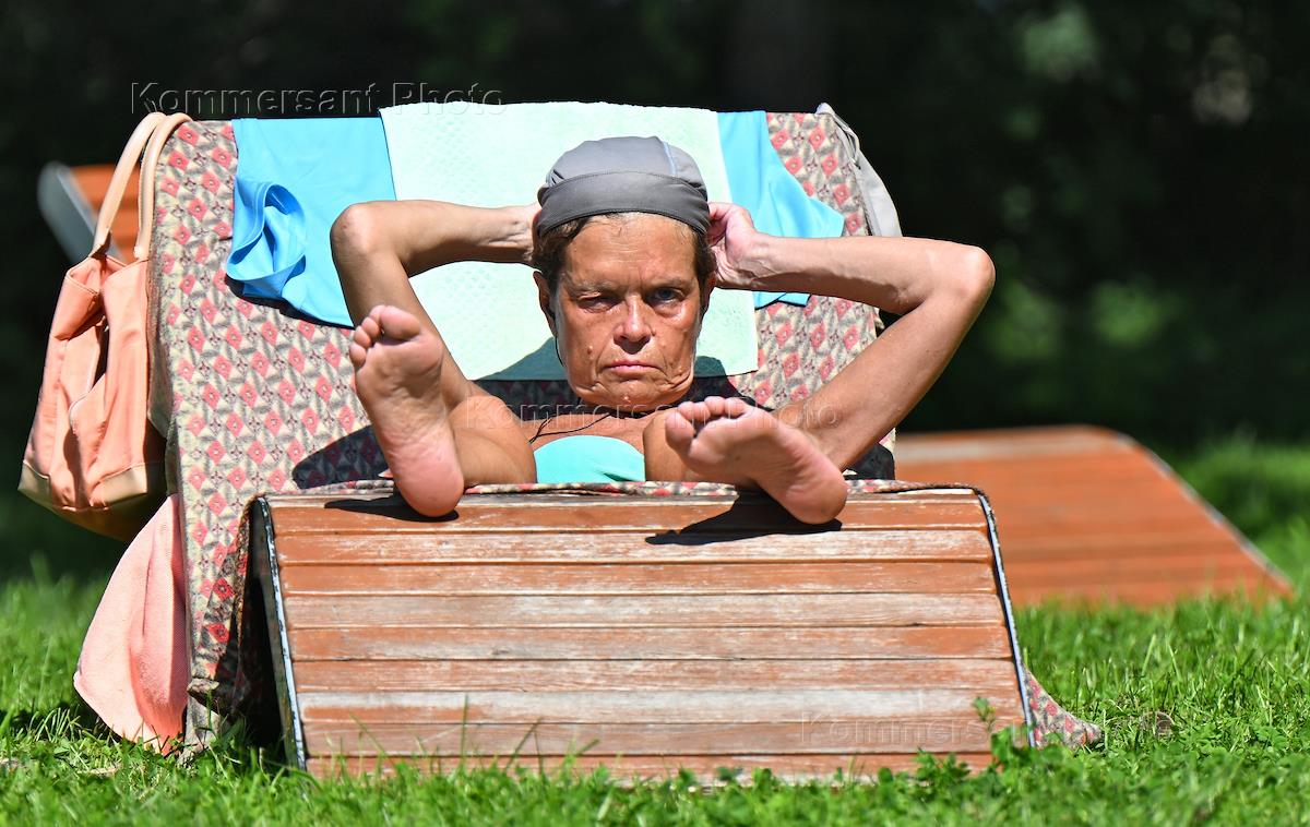 Виды Москвы. Жанровая фотография. Женщина загорает на пляже в Измайловском парке.