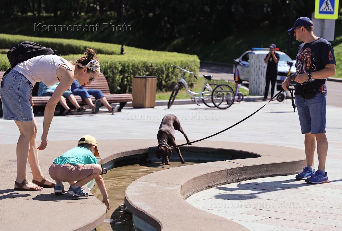Жара в Москве. Жанровая фотография. Мама с ребенком и мужчина с собакой у фонтана в сквере.
