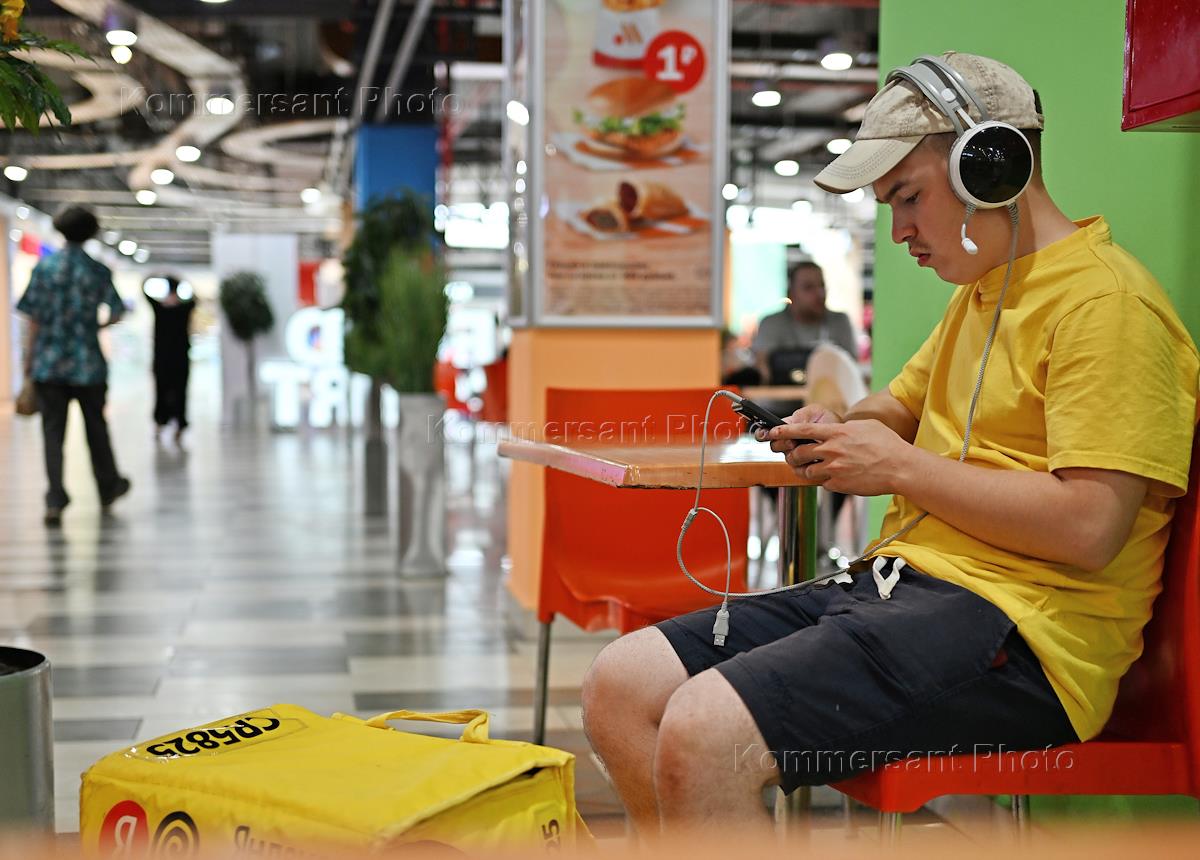 Виды Уфы. Жанровая фотография. Курьер в ожидании заказа в кафе.