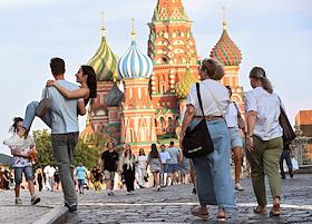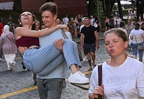 Виды Москвы. Жанровая фотография. Прохожие на Красной площади. Парень несет девушку на руках.