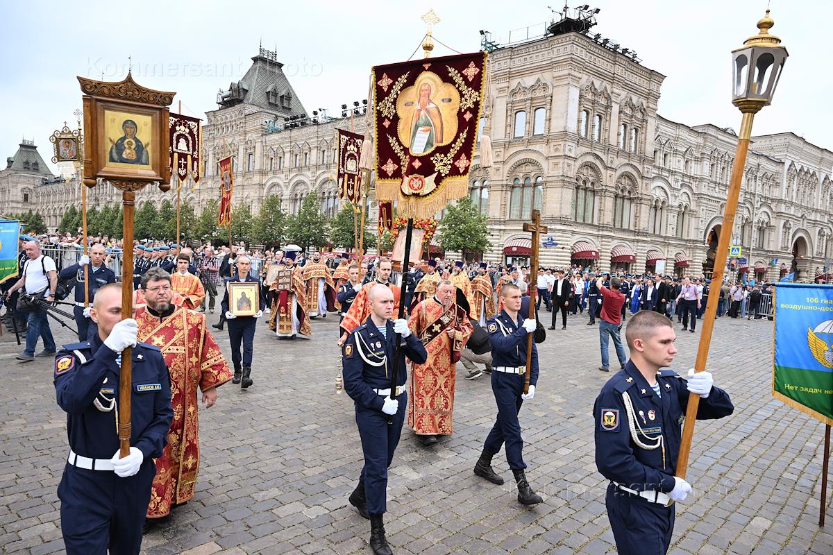 Армия и ВПК Праздничные мероприятия, посвященные 95-й годовщине создания Воздушно-десантных войск (ВДВ) России, на Красной площади. День ВДВ России отмечают 2 августа в день памяти пророка Илии, небесного покровителя Воздушно-десантных войск. Участники Крестного хода из храма Пророка Божия Илии в Китай-городе до Лобного места на Красной площади.