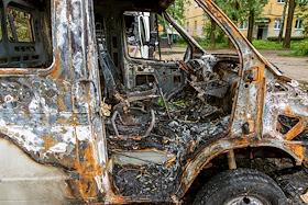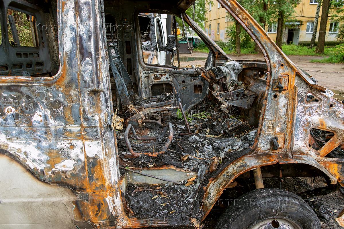 Последствия попадания беспилотного летательного аппарата (БПЛА) на жилой район города. Сгоревший…