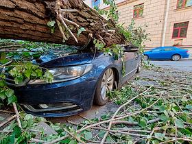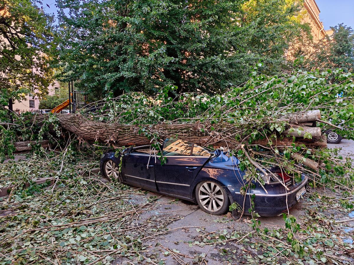 Виды Санкт-Петербурга. Жанровая фотография. Дерево, упавшее на машину, на Большой Разначинной улице.