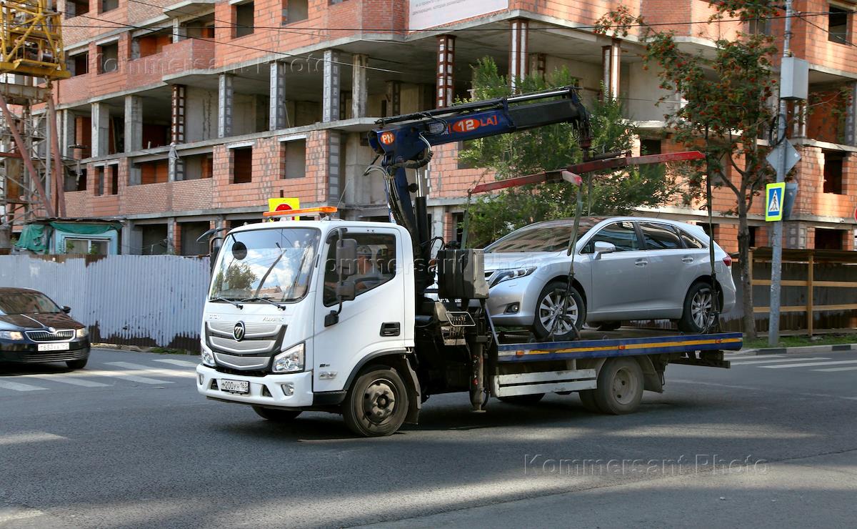Виды Омска. Жанровая фотография. Автомобиль-эвакуатор с легковым автомобилем на улице.