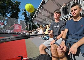 Казахстанский теннисист Александр Бублик (справа) во время мастер-класса на открытом пространстве…