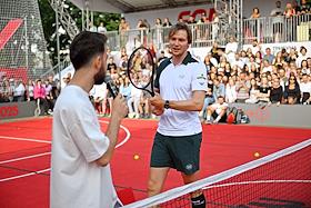 Казахстанский теннисист Александр Бублик (слева) во время мастер-класса на открытом пространстве…