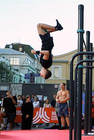Спортивный фестиваль "День Физкультурника" в Москве. Соревнования по акробатике на Тверской улице.