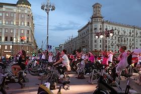 Спортивный фестиваль "День Физкультурника" в Москве. Соревнования по сайклу на Пушкинской площади.