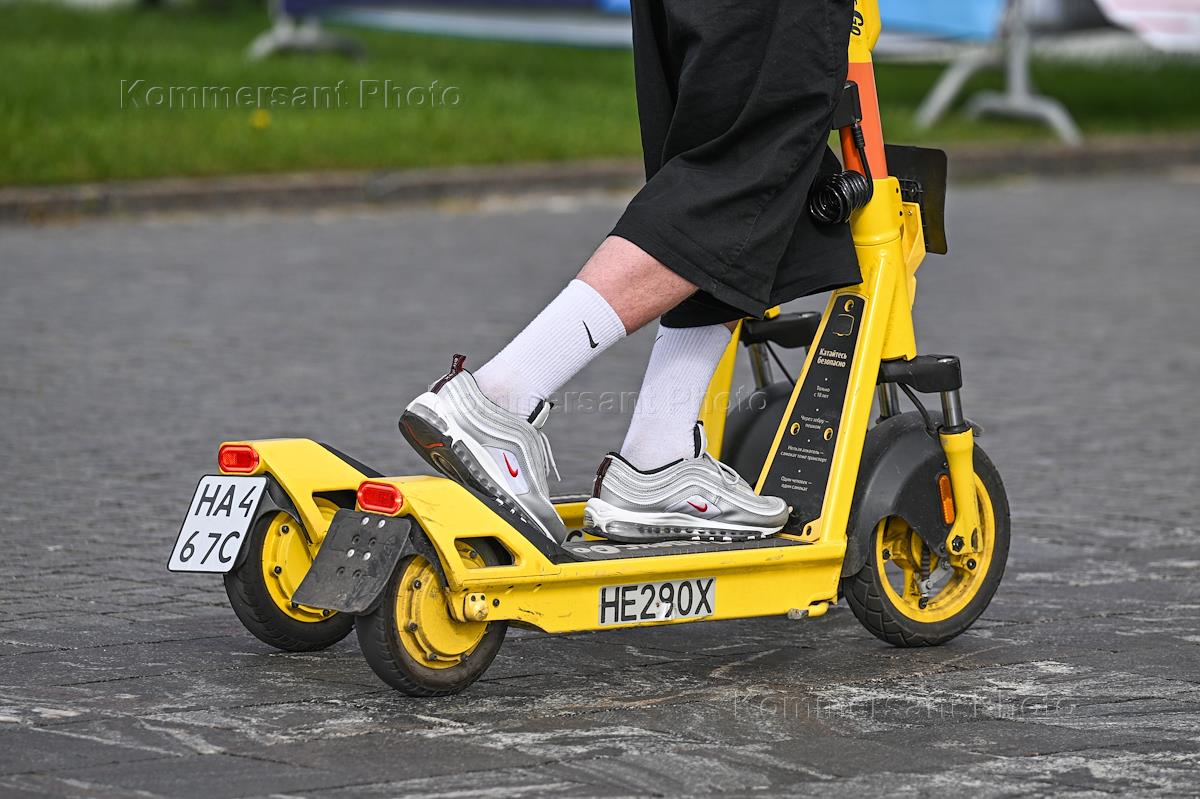Жанровая фотография. Техник сервиса кикшеринга "Яндекс Go" во время расстановки электросамокатов на…