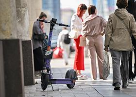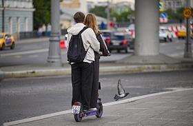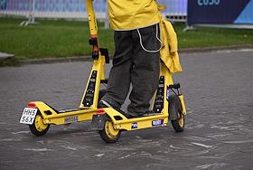 Жанровая фотография. Электросамокат "Юрент" с испорченным номером на улице.