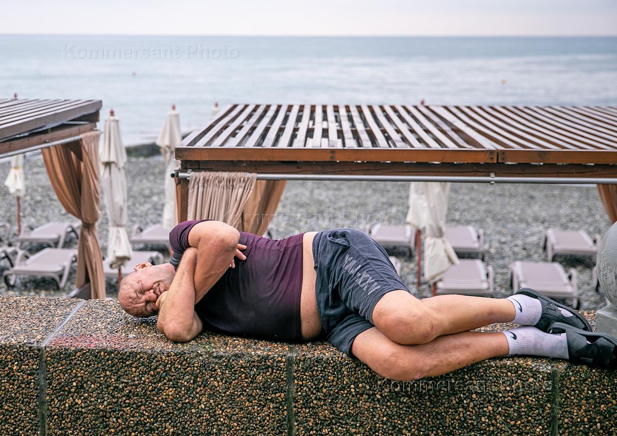 Жанровая фотография. Отдыхающий спит на парапете ограждения на берегу Черного моря на пляже "Чайка"…