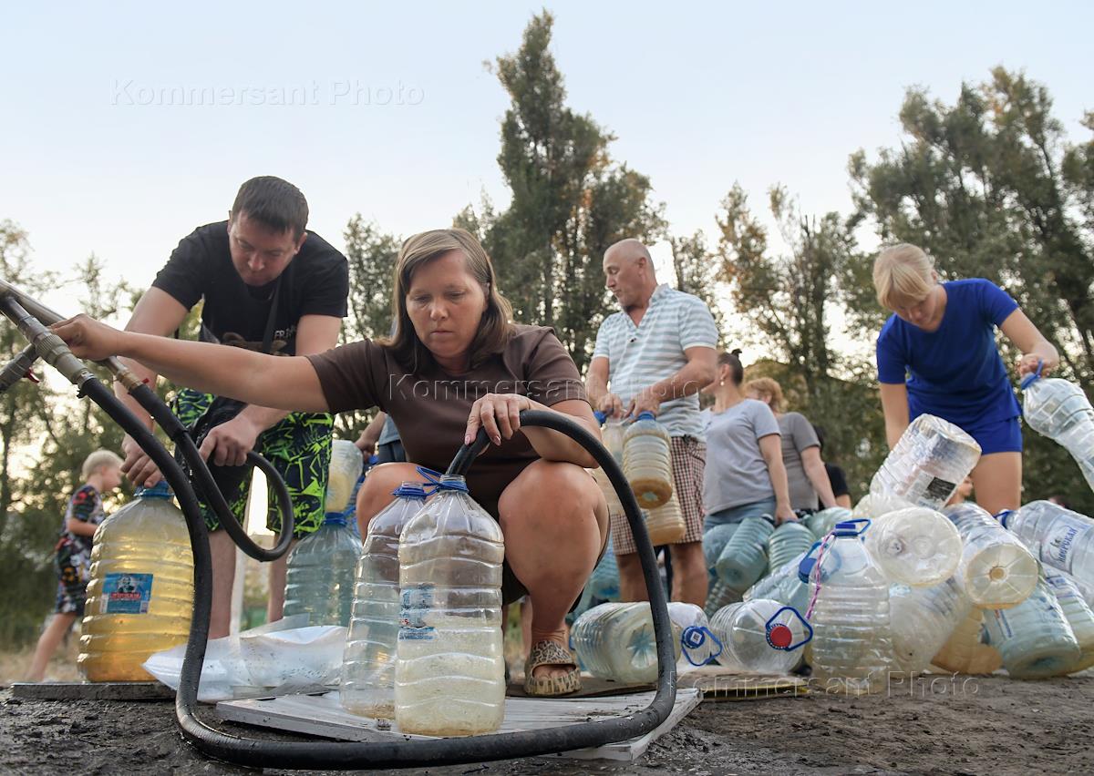 Ситуация с подвозом воды в Кировском районе Донецка. Жители наливают воду в канистры у…