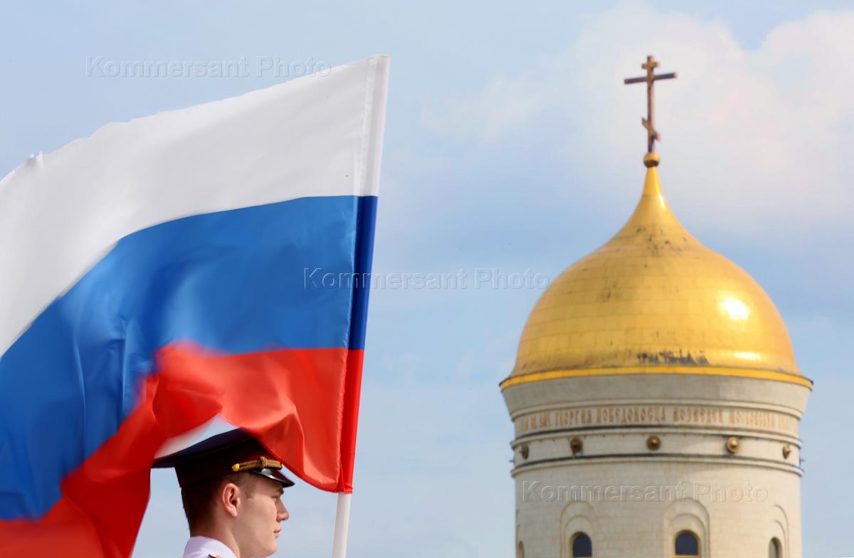 Празднование Дня Государственного флага России на Поклонной горе у Музея Победы. Участники во время…