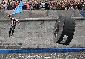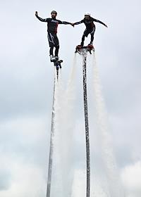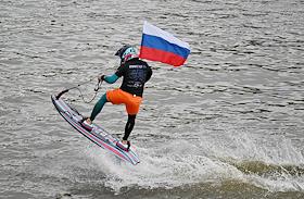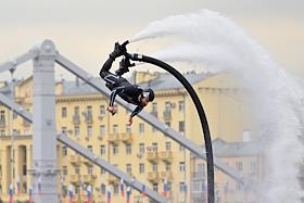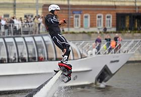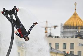 Спортивно-развлекательный фестиваль "ЛетФест" на Крымской набережной. Участник водного шоу во время…