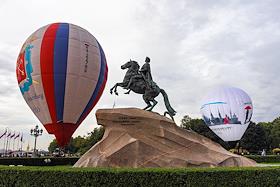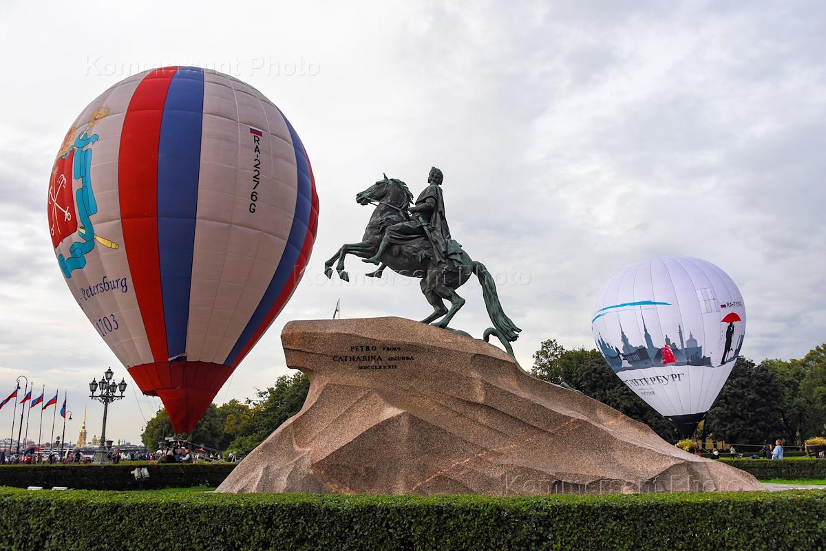 Фестиваль воздухоплавания "Мечтать! Летать!". Жанровая фотография. Воздушные шары у памятника Петру…