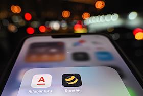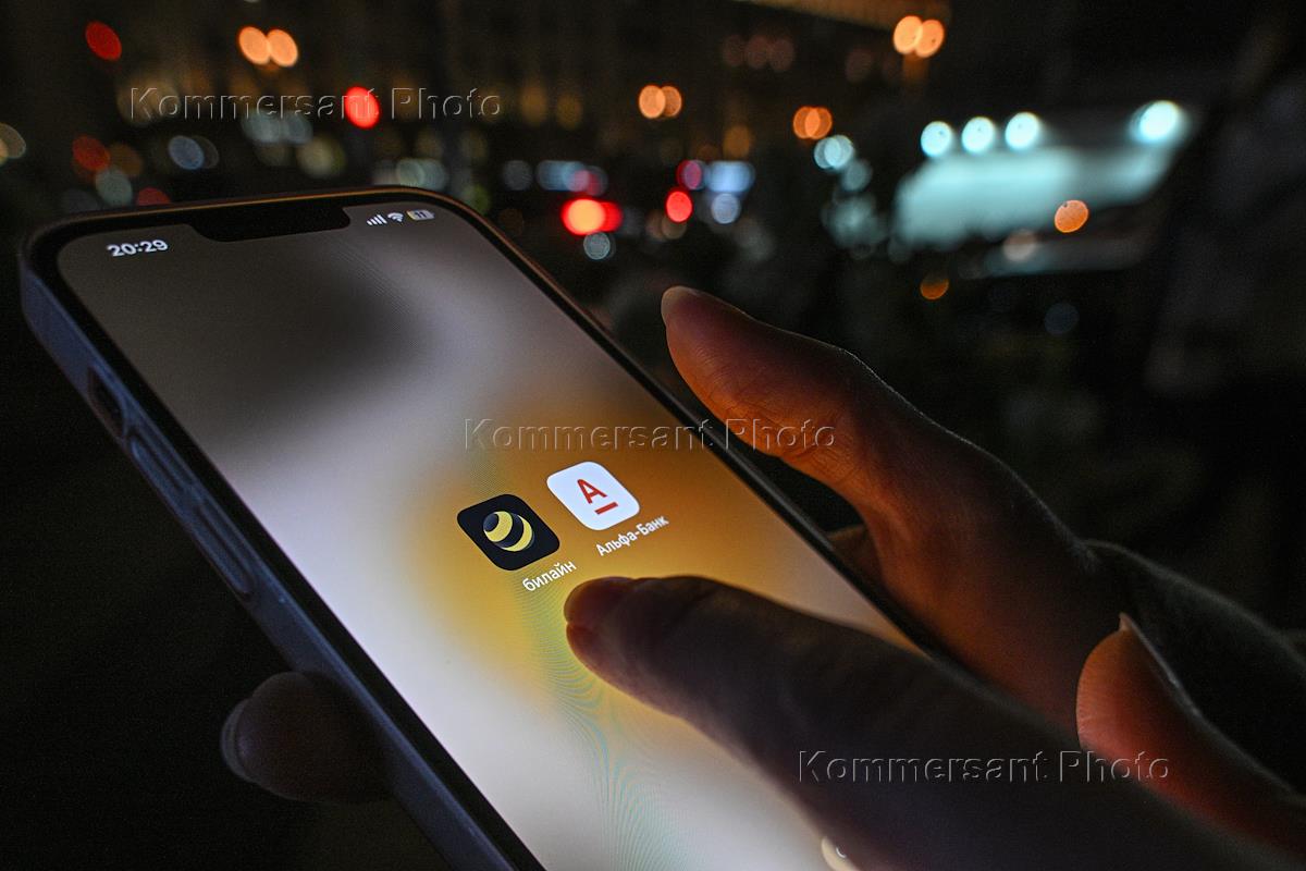Жанровая фотография. Логотипы "Билайн" и "Альфа-Банк" на экране мобильного телефона.