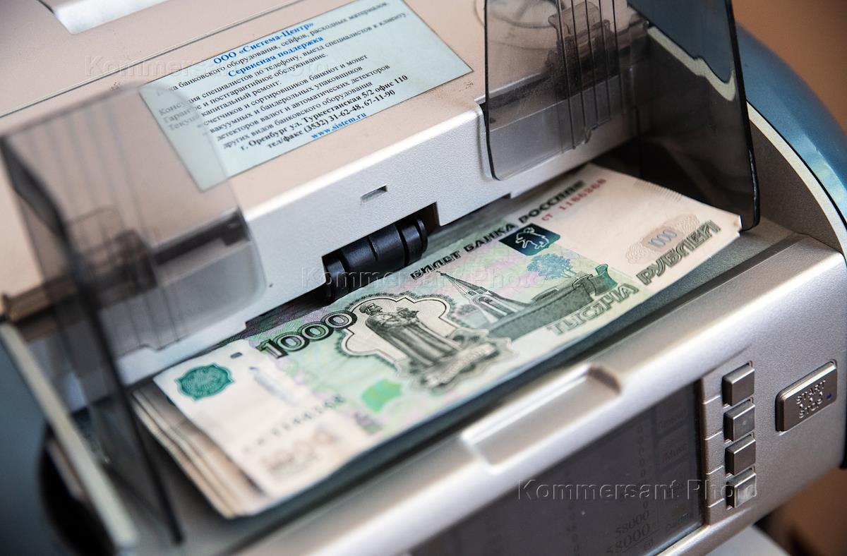 Жанровая фотография. Тысячные купюры в аппарате для подсчета денег и проверки их на подлинность.