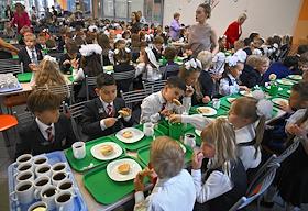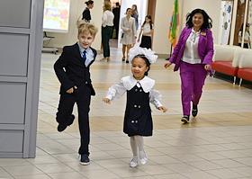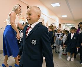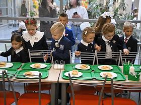 День знаний в московской школе № 1409. Учащиеся первого класса в столовой.