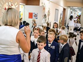 День знаний в московской школе № 1409. Первоклассники в школе после торжественной линейки,…