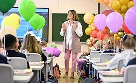 День знаний в московской школе № 1409. Учительница с учениками первого класса после торжественной…