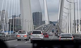Виды Владивостока. Жанровая фотография. Автомобили едут по вантовому мосту на остров Русский.