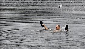 Виды Владивостока. Жанровая фотография. Мужчина купается в море с туфлями в руках.