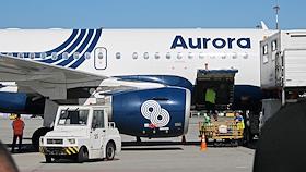 Виды Владивостока. Жанровая фотография. Самолет авиакомпании Aurora на взлетной полосе.