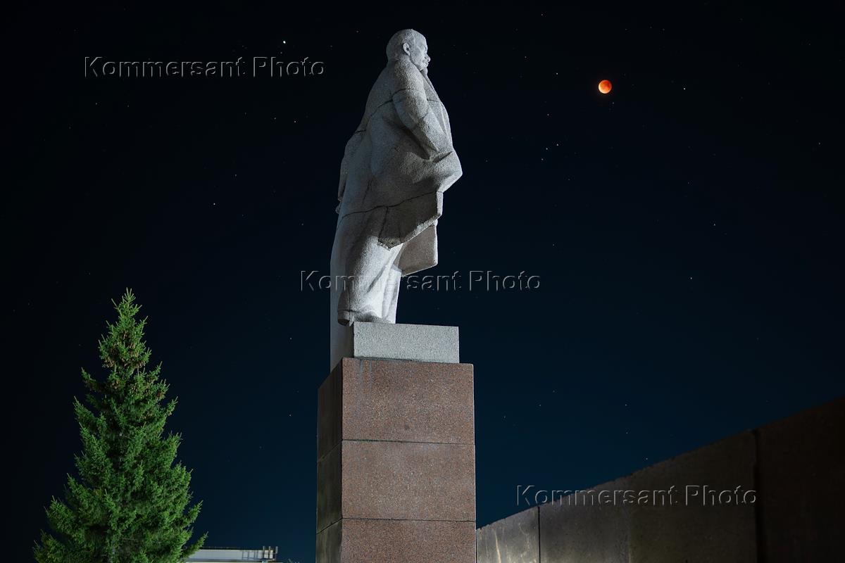 Жанровая фотография. Памятник Ленину на улице Радищева и луна в ночном небе во время полного лунного…