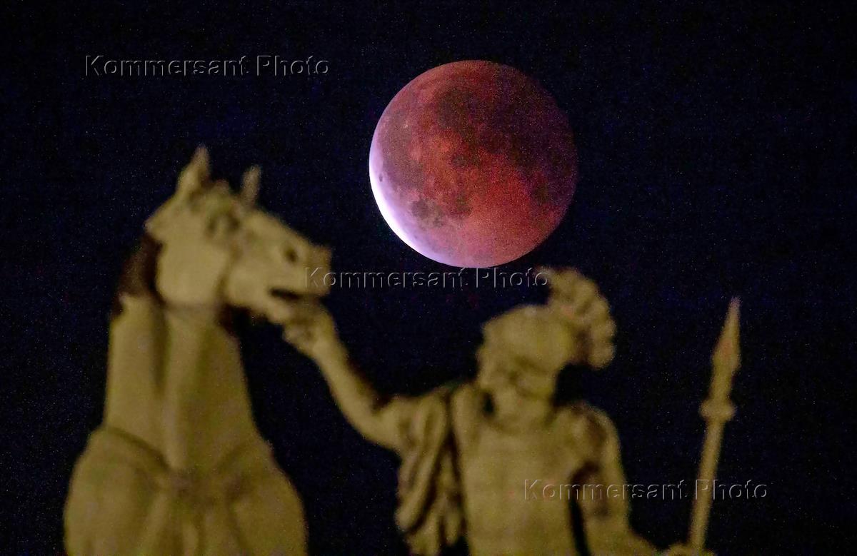 Жанровая фотография. Красная луна во время полного лунного затмения над монументом "Колесница Славы"…