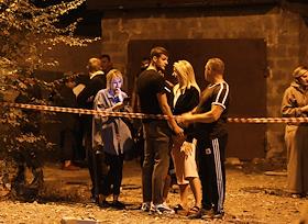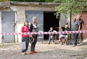 Последствия обстрела многоквартирного дома в Буденовском районе. Жители во дворе пострадавшего дома.