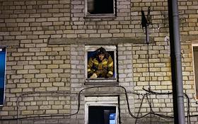 Последствия обстрела многоквартирного дома в Буденовском районе. Пожарный МЧС России в окне…
